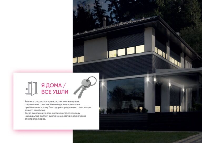 Такая схема сценария подразумевает открытие «умных» рольставен при приближении их хозяев к дому за счет геолокационного определения, озвучивания голосовой команды или посредством нажатия клавиши дистанционного пульта. При покидании дома, система автоматически передаст специальный сигнал на закрытие роллетного устройства, отключение электрических и осветительных приборов.