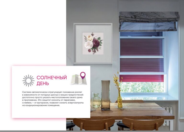 В этом случае имеется возможность выполнять настройки с указанием места нахождения дома через специальное мобильное программное приложение. Тогда автоматическая система самостоятельно будет регулировать рабочие позиции «умных» рольставен, с учетом индивидуальных предпочтений и погодных условий. Это защитит помещение от сильного перегрева, а мебельные предметы от выгорания. Кроме того, данный вариант способствует значительному снижению расхода электричества на кондиционировании.